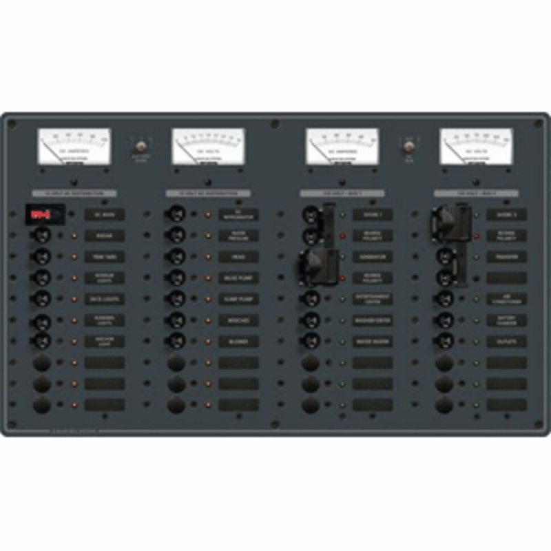 AC Main +12 Positions / DC Main +19 PositionsPN:3086Black SwitchesIncludes set of 30 common AC and 30 common DC labelsAll AC and DC buses installed, fully pre-wiredLabel backlighting pre-installedAll LEDs installedMaximum panel Amperage 100 Amperes DC 50 A
