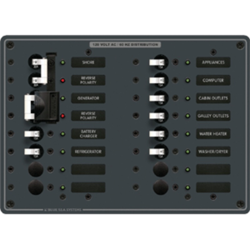 AC 2 Sources + 12 Positions(2) 30A Double Pole Circuit Breakers(8) 15A Single Pole Circuit BreakersDouble pole AC main circuit breakers with installed lockout slide Prevents connecting both AC sources simultaneously Maximum panel amperage - 50 Amperes Red
