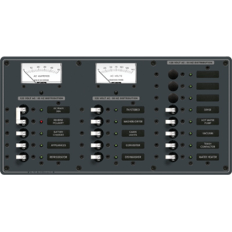 AC Main + 16 Positions(1) 30A Double Pole Circuit Breakers(13) 15A Single Pole Circuit Breakers(1) 9630 AC Analog Ammeter(1) 9353 AC Analog VoltmeterRed reverse polarity indicating LED All hot, neutral and safety ground buses installed, fully pre-wired All