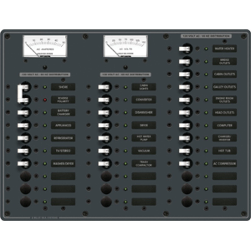 AC Main + 31 PositionsColor: White30A Double: 115A Single: 22Meters: Analog 9630 Ammeter & 9353 VoltmeterRed reverse polarity indicating LED All hot, neutral and safety ground buses installed, fully pre-wired All circuit label positions are backlit on stan