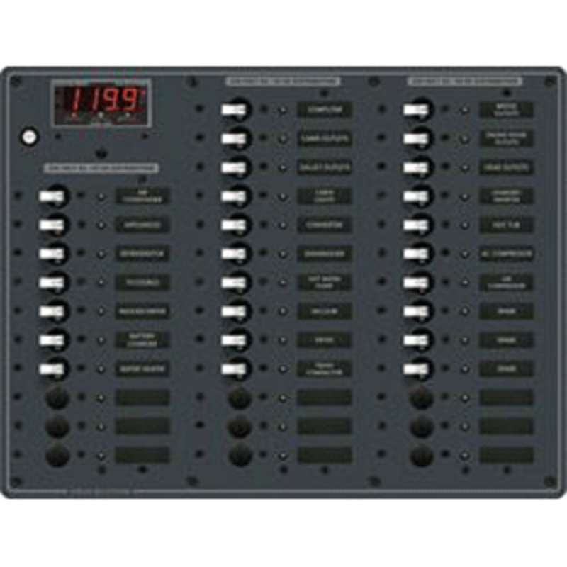 AC 36 Position (European)PN:8584White SwitchesIncludes Blue Sea 8247 Digital MeterFeatures: All hot, neutral and safety ground buses installed, fully pre-wiredLabel backlighting pre-installedDetailed installation instructions and cutout templateAll LEDs in