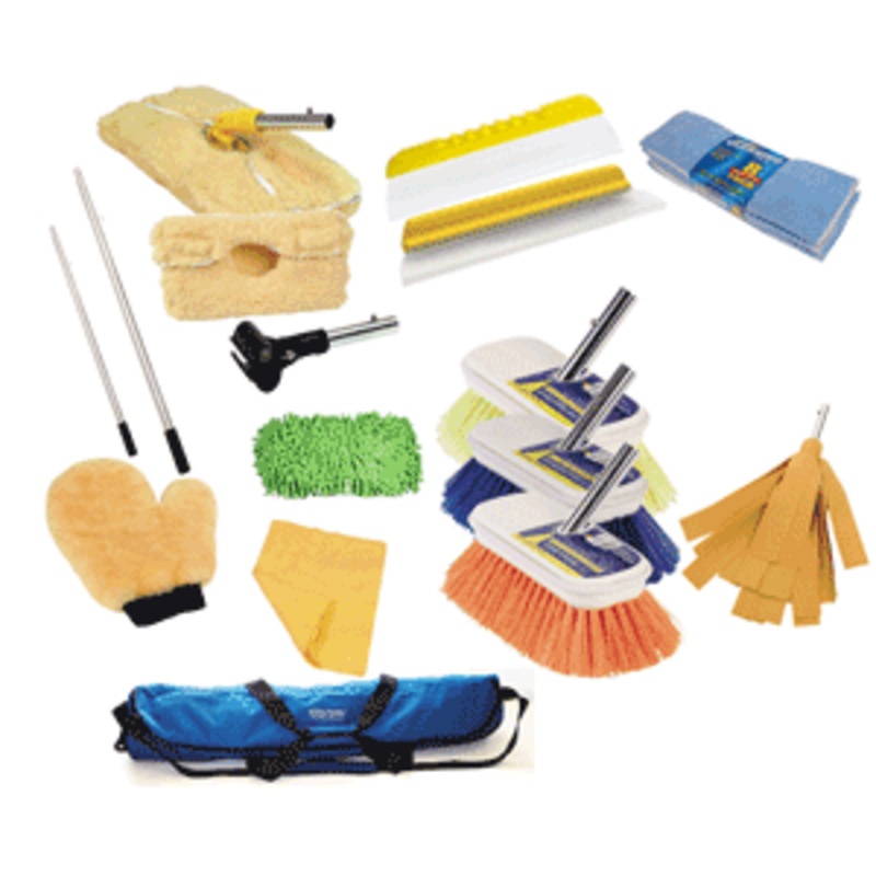 SW85000: The ultimate cleaning kit available! 6′-11′ telescoping Perfect Pole, 3′-6′ telescoping Perfect Pole, extra soft brush, soft flagged brush, medium brush, soft washing tool, genuine sheepskin replacement bonnet, genuine sheepskin wash mitt, chenille micro fiber sponge, Aquazorber 2″ drying mop, AquaDry PVA cloth, 12″ Flexi-gel hand held water blade, 14″ Quik Dry water blade, Quik Dry adapter, terry micro fiber 5pk towels.